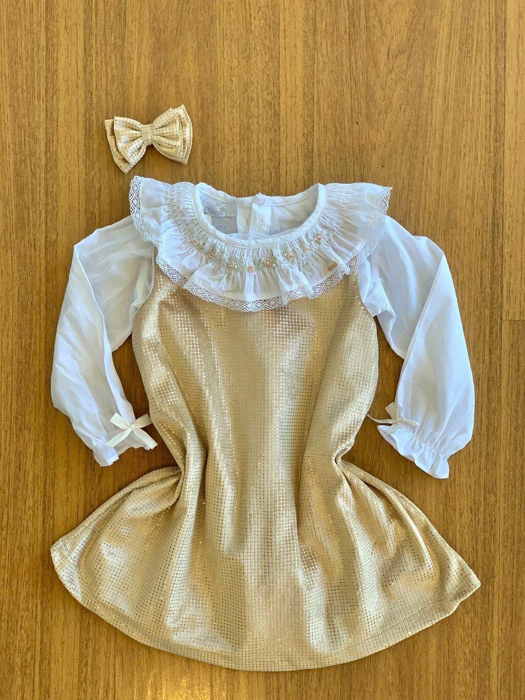 🔹 Por que escolher o Vestido Dourado Roana? - Tecido de camurça macio e sofisticado - Blusa interna com bordados manuais e laise - Punhos com elástico e laço nas mangas - Design exclusivo para momentos marcantes